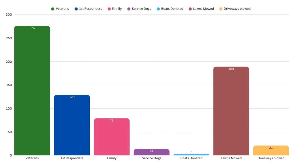 Since 2021, our dedicated staff has hosted 276 Veterans, 129 1st Responders, 14 Service Dogs and 79 of our hero's family members on the water. Our staff has also mowed 189 lawns and plowed 21 driveways free of charge to members of the community including the elderly, families of deployed soldiers and people living with mobility restrictions.